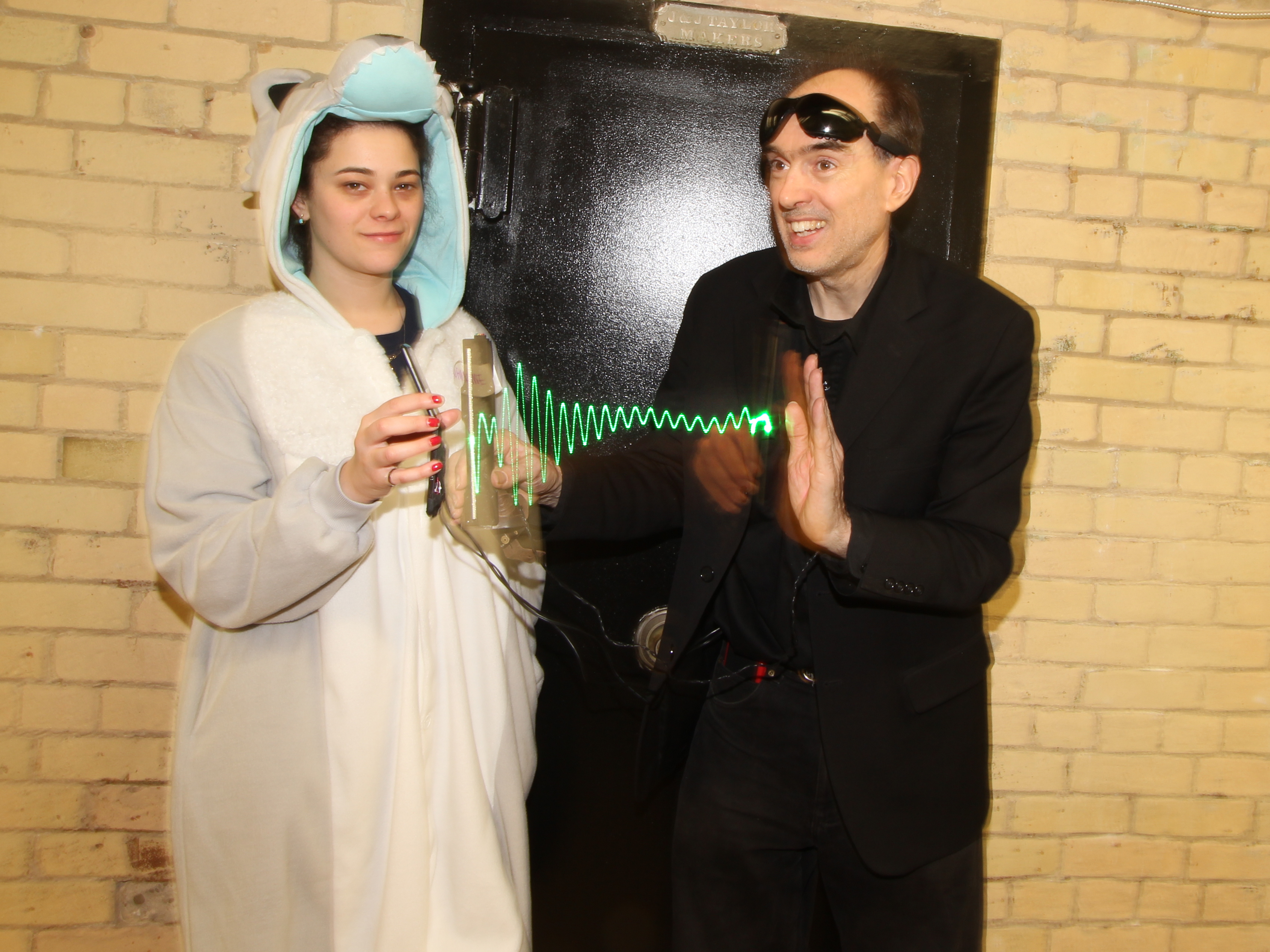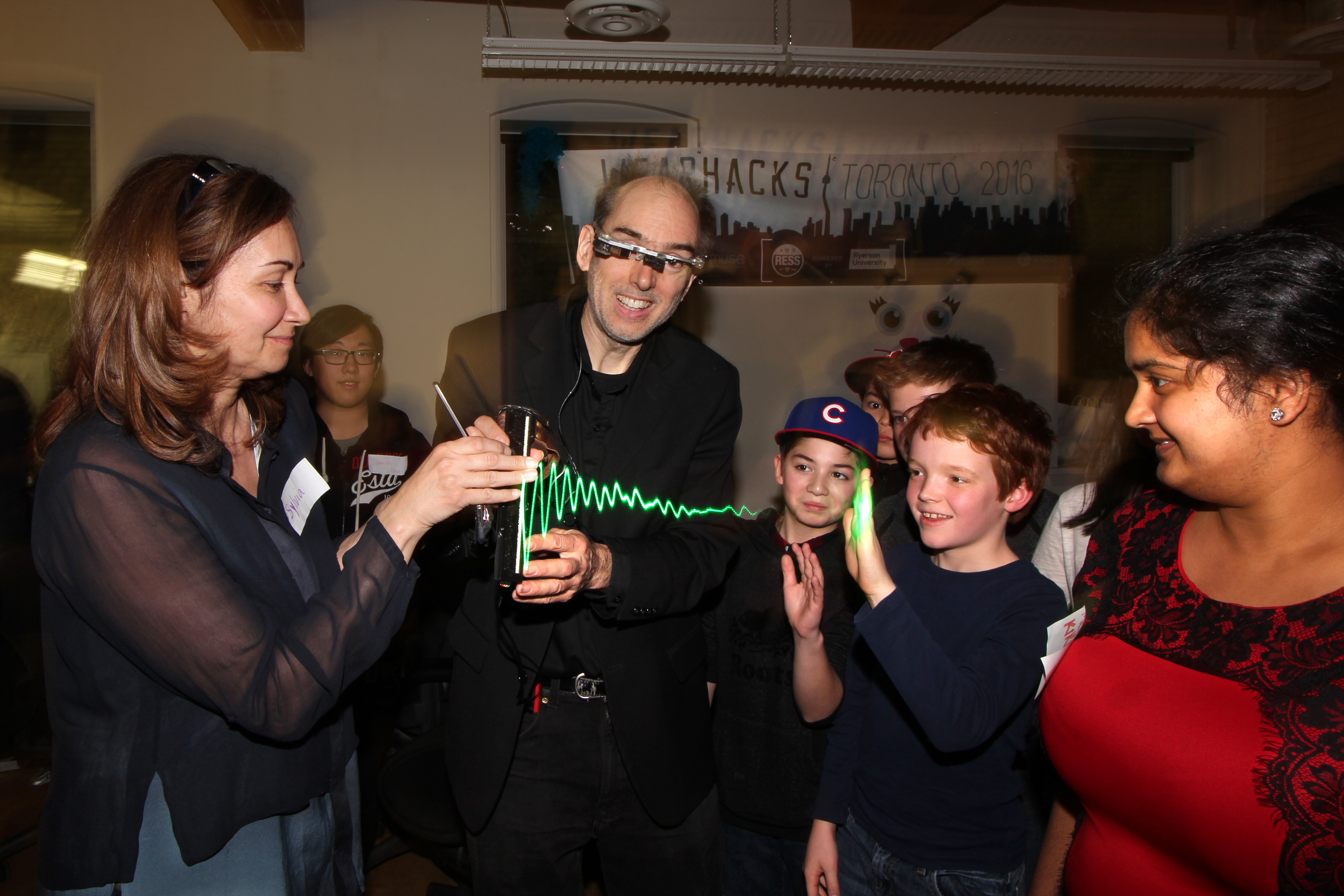 Among many live demos was the S.W.I.M. (Sequential Wave Imprinting Machine) wearable computing and augmented reality system Mann originally built at the age of 12, back in 1974, to measure the speed of light and the speed of sound, and, more importantly, to express radio waves in a coordinate system that moves at the speed of light, with the waves, so as to make them appear to sit still (or at the speed of sound for sound waves), as Phenomenological AR (Augmented Reality) overlays.