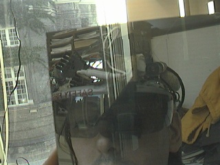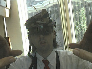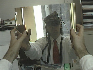 One computer goes to the big screen projector and runs a Web broswer that's pointed to my right eye (e.g. visits my EyeTap site). A second computer runs sfspeaker (SpeakFreely) and is connected to the PA system, and is responsive to the microphone array of my apparatus. A third computer runs sfmike and is set up so that I can hear the audience, their reactions to my lecture, and such. The third system sends the sound back to me, so that I can get audience feedback without acoustic feedback (e.g. I can hear the audience without getting the screech or squealing sound of positive feedback run amok).