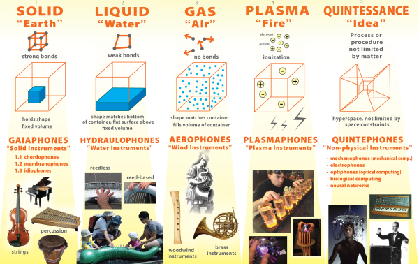 Earth (solid), Water (liquid), Air (gas), Fire (plasma), and Idea (informatics)