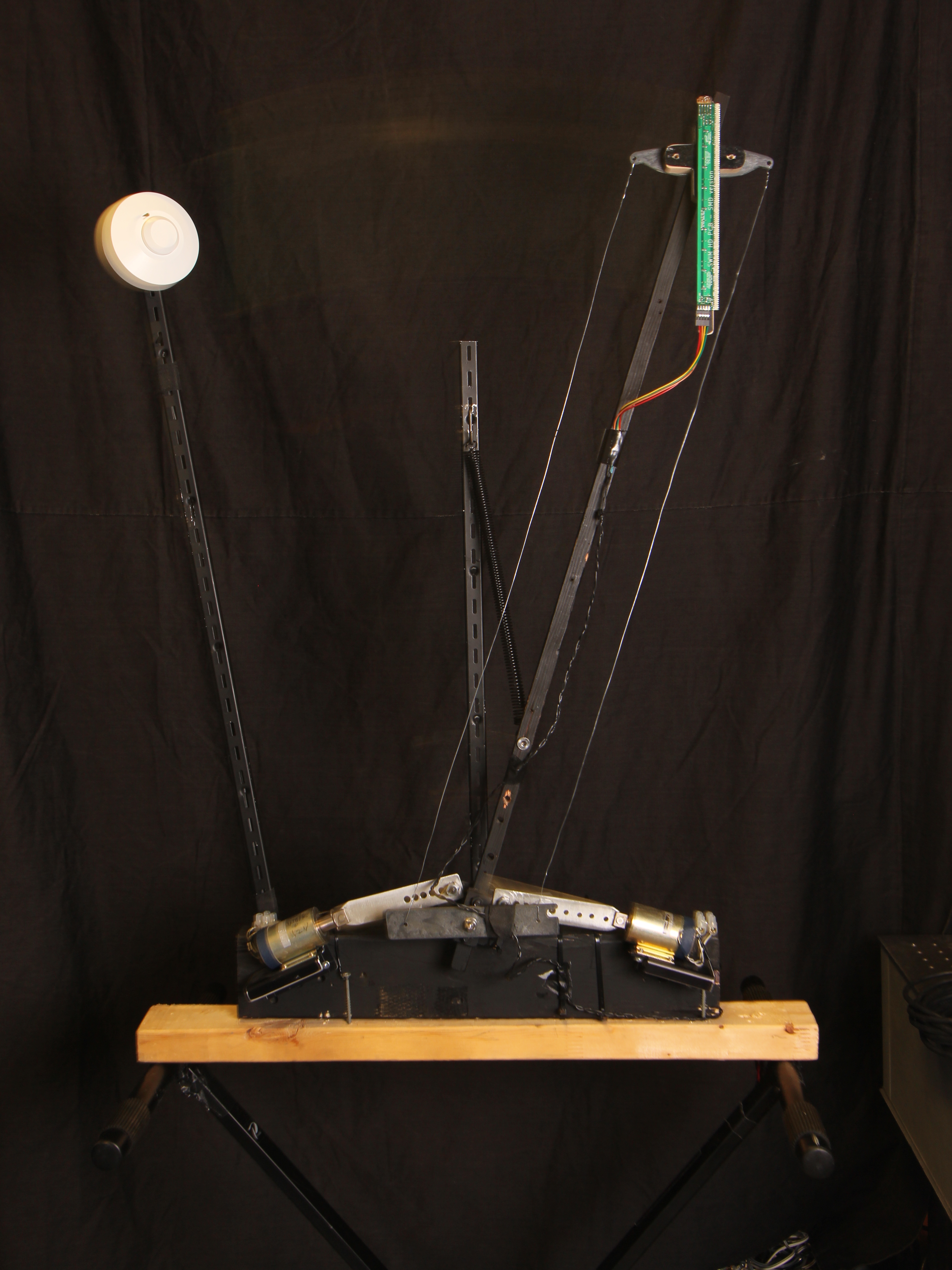 The SWIM is an invention from my childhood, and here are some pictures of it mounted to a robot that Kyle and I (Steve), with some input from Pete, built together. We built it, for the most part, in a day or so (with further subsequent tweaks later). In regards to the design, I was inspired by the windshield washers on a bus I saw where the wiper blades always remained vertical even though they were traced in a circular arc.